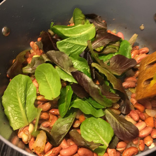 2. Throw chopped onions, pepper, carrots in a large pot over medium heat and saute them in a little oil (of your choice) until onions are golden. Then toss in fresh greens and the rinsed/drained beans.